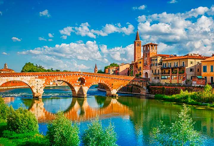 Aamupäivällä tutustumme kävellen paikallisoppaan kanssa Veronan sydämeen. Kierroksen aikana tutustumme hotellin viereiseen Piazza Bra -aukioon, joka on kaupungin sydän ja jolla sijaitsee roomalaisten rakentama amfiteatteri Arena, jokavuotisen Oopperajuhlan esityspaikka. Keskiaikaiset kauniit palatsit Piazza Erbellä, Scala-suvun palatsit ja tunnelmallinen kotikirkko sekä Rooman valtakunnan ajan nähtävyydet kertovat Veronan pitkästä historiasta. Shakespeare sijoitti Romeon ja Julian tapahtumat Veronaan, niinpä näemme kierroksella myös Julian parvekkeen ja Romeon kotitalon. Lounas kaupungilla.