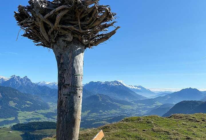 Pidämme lounastauon (omakustanteinen) avoinna olevassa gasthausissa. Täältä avautuu hulppeat näkymät niin St. Johanin laaksoon ja Wilder Kaiserin vuoristoon. Paluu joko hissilinjaa myötäilevää metsäpolkua kävellen, tai hissillä alas (lisämaksusta) suoraan hotellin viereen. Reitin pituus joko 6 tai 10 km, nousumetrejä molemmissa vaihtoehdoissa yli 500 m. Reitti on maastoltaan helpohko, mutta tasaisesti kertyvät nousumetrit nostavat patikan fyysistä vaativuutta.