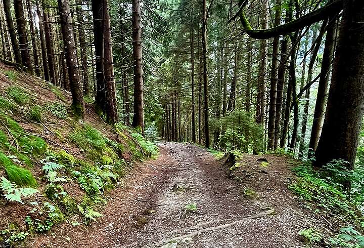 Patikka alkaa suoraan hotellilta, kohteena Harschbichlbahnin välihissiasema kolmen Gasthausin ( Hirschberg, Bassgeigeralm & Mülneralm) kautta.