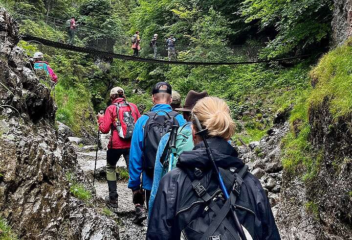 Aamiaisen jälkeen lähdemme paikallisbussilla St.Johanista Erpfendorfiin (n. 15min) Griessbachaklamm patikan lähtöpaikalle. Kuljemme alkuun upeaa kanjonireittiä seuraten joen vartta, ylittäen joen muutaman kerran lyhyitä riippusiltoja pitkin. Kanjonin jälkeen nousemme metsän läpi mutkittelevaa jyrkkää polkua kohti alppiniittyjä, jossa meitä odottaa Huber Amlin ravintola upeine maisemineen Wilder Kaiser vuoristoon. Huber Almilla vietetyn lounastauon jälkeen lähdemme laskeutumaan hiekkatietä kohti lähtöpaikkaa. Kokonaisvaellusaika n. 4 tuntia, matkaa yhteensä 11 km, jossa nousumetrejä kertyy yli 500, reitin korkeimman kohdan ollessa 1135 m.