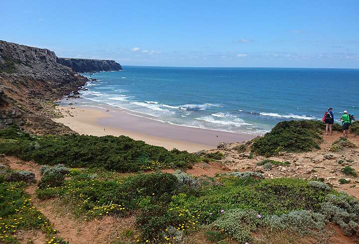 (n. 10 km) ryhmä aloittaa vaelluksen. Lyhyemmän reitin (n. 7 km) valinneet siirtyvät bussilla reitin varrelle ja patikoivat loppuosuuden Carvoeiroon. Päivän reitti kulkee ainutlaatuisia rannikkopolkuja pitkin kohti Carvoeiroa, jossa molemmat ryhmät kohtaavat.