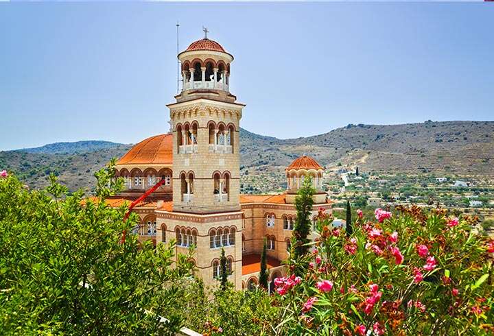 saarta sijaitseva Agios Nektarioksen eli Pyhän Nektarioksen luostari ja kirkko.
