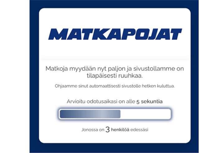 Suosituimmat matkat kiinnostavat tuhansia – samaan aikaan. Verkkosivumme ei voi vastaanottaa rajattomasti kävijöitä yhdellä hetkellä, joten ruuhkatilanteisiin olemme kehittäneet odotushuonepalvelun. Matkapoikien odotushuonepalvelu takaa sujuvan sivuston käytön myös varaushuipun aikana.