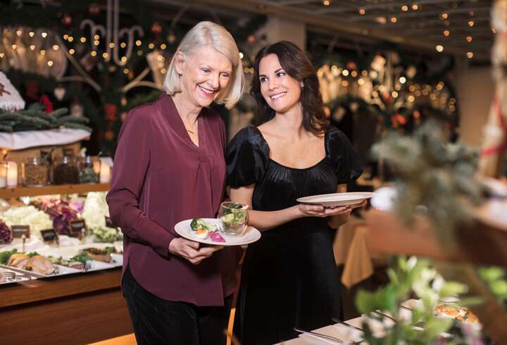 Maistuvan buffetin lisäksi voit myös nauttia laivan kauneimmasta merinäköalasta. Kerää suosikkisi noutopöydästä ja nauti maukkaista alku- ja pääruoista sekä hevosenkengän muotoisesta runsaasta jälkiruokapöydästä, vegaanisia herkkuja unohtamatta. Viini, olut, virvoitusjuomat ja kahvi sisältyvät hintaan.
