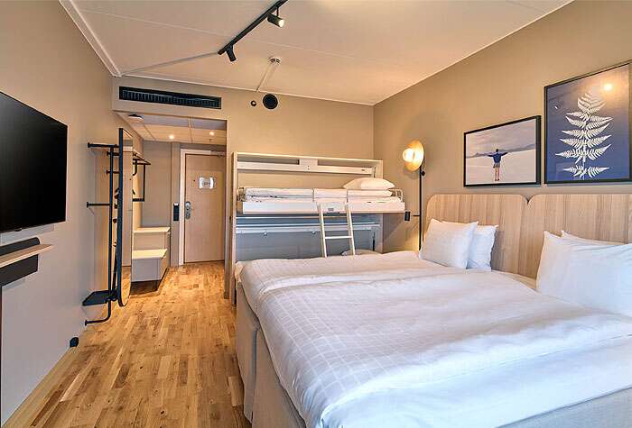 Aivan sataman vieressä sijaitseva hotelli kutsuu viihtymään ennen unohtumatonta Kolmården-päivää. 🦁