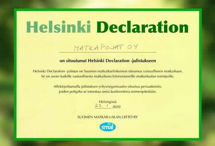 Matkapojat Oy is committed to promoting sustainable tourism in all its activities. We have taken an active role in mitigating climate change. We protect biodiversity and respect human rights and local culture. We are aware of the impact of the tourism industry on the environment and society, and we work purposefully to minimize those impacts.